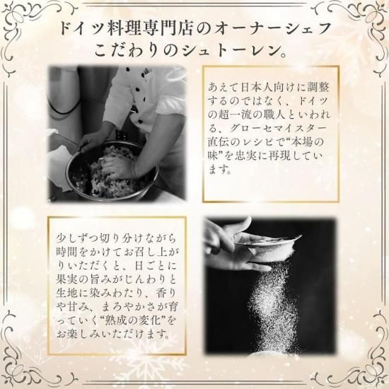 洋酒に漬け込んだドライフルーツやナッツをふんだんに練りこみ焼き上げたドイツの伝統焼き菓子