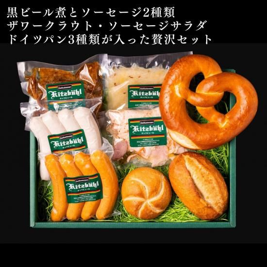 直営レストランで人気の黒ビール煮・ソーセージ2種類・ザワークラウト・ソーセージサラダ・ドイツパン3種類が入ったセット